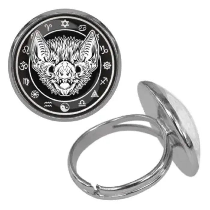 Безразмерное кольцо с изображением летучей мыши. Изготовлено из бижутерного сплава с покрытием под серебро, изображение защищено выпуклой стеклянной линзой.