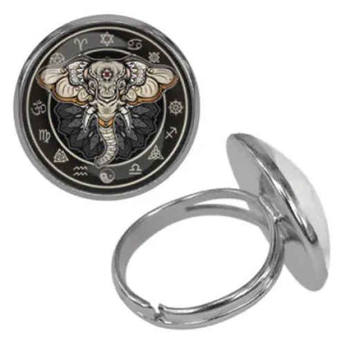 Безразмерное кольцо из бижутерного сплава с изображением слона под выпуклой стеклянной линзой.