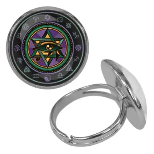 Безразмерное кольцо с символом Око Гора. Изготовлено из бижутерного сплава, изображение расположено под выпуклой стеклянной линзой.
