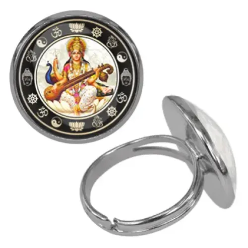 Безразмерное кольцо с изображением Сарасвати. Изготовлено из бижутерного сплава с покрытием под серебро, украшено выпуклой стеклянной линзой.