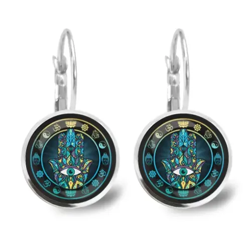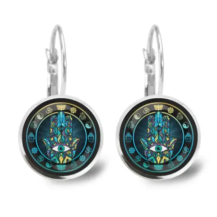 Серьги Хамса — это стильный аксессуар, который сочетает в себе традиционный символ защиты и современный дизайн. Эти серьги диаметром 18 мм украшены изображениями под выпуклыми стеклянными линзами, что придаёт им особую выразительность.