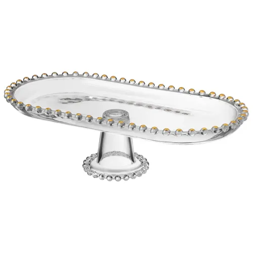 Блюдо выполнено из прочного стекла, что обеспечивает гигиеничность и визуальную лёгкость. Устойчивая ножка является конструктивным элементом, приподнимающим сервировочную поверхность для удобной подачи. Декоративная бусинная кайма по краю служит стилистическим акцентом коллекции.