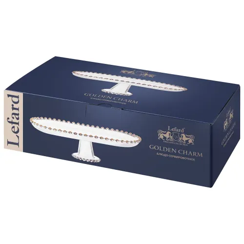 Сервировочное блюдо на ножке Lefard из коллекции Golden Charm предназначено для подачи десертов и закусок. Изделие изготовлено из стекла, его дизайн дополнен декоративной бусинной каймой.