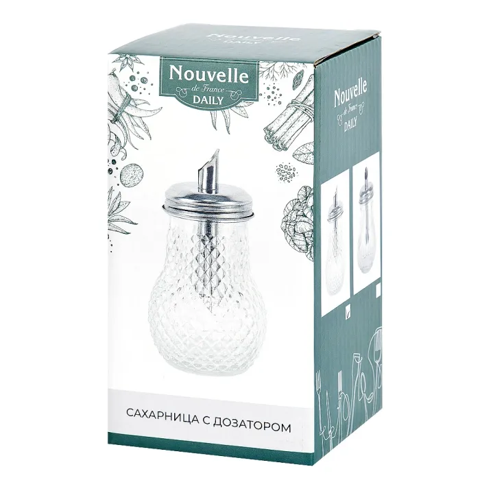 Сахарница с дозатором предназначена для хранения и порционной подачи сыпучих продуктов. Изделие изготовлено из стекла и нержавеющей стали под торговой маркой Nouvelle Daily.