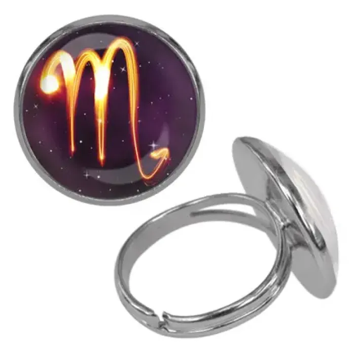 Безразмерное кольцо с изображением знака зодиака Скорпион станет стильным аксессуаром для каждого. Это изделие выполнено из бижутерного сплава с покрытием под серебро и украшено стеклянной линзой диаметром 18 мм, что придаёт ему особую выразительность. Упаковано в прозрачный пакет, что делает его отличным вариантом для подарка или личного использования. Кольцо символизирует силу и страсть, присущие представителям этого знака зодиака.