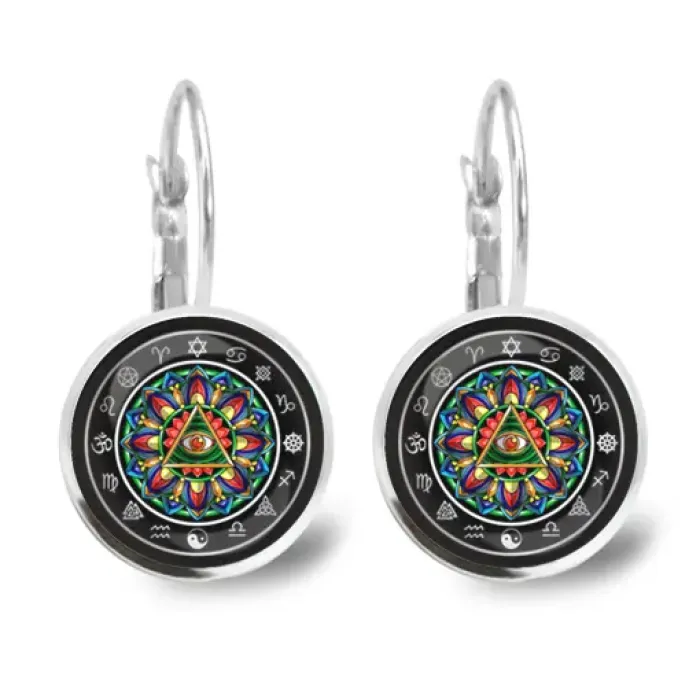 Серьги-сувенир из бижутерного сплава с изображением Всевидящего ока под выпуклой стеклянной линзой.