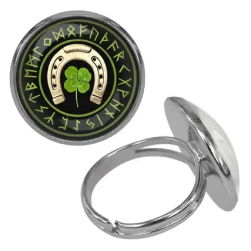 Безразмерное кольцо 'На счастье и удачу' — сувенирное украшение из бижутерного сплава с дизайном под выпуклой стеклянной линзой.