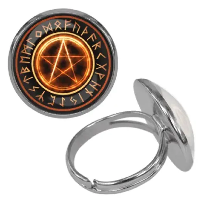 Безразмерное кольцо с изображением огненной пентаграммы. Изготовлено из бижутерного сплава с покрытием под серебро и стеклянной линзой.