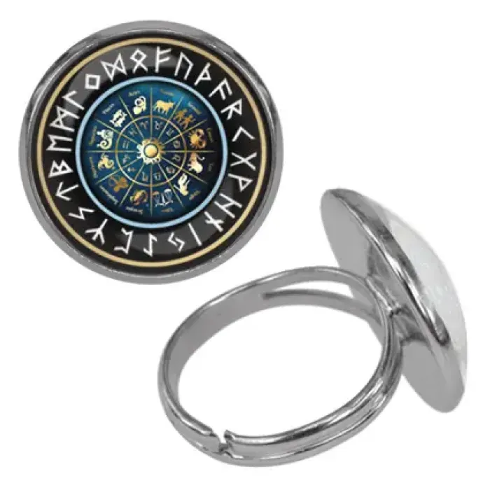 Безразмерное кольцо с изображением астрологической мандалы. Изготовлено из бижутерного сплава со стеклянными вставками.