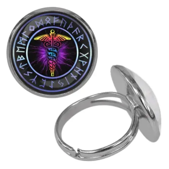 Безразмерное кольцо с символом кадуцей. Изготовлено из бижутерного сплава с покрытием под серебро, изображение расположено под выпуклой стеклянной линзой.