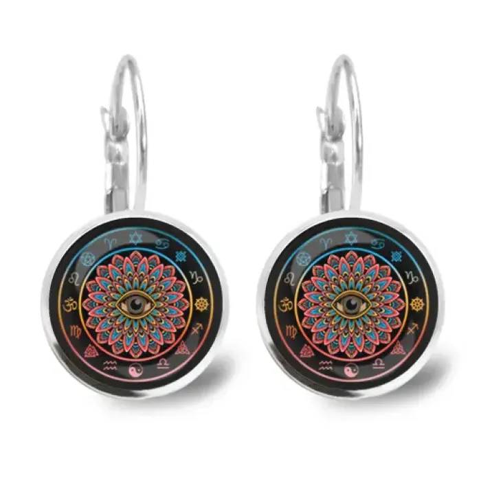 Серьги с дизайном «Мандала Глаз». Изготовлены из бижутерного сплава со стеклянными вставками.
