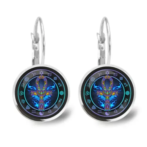 Серьги-сувенир из бижутерного сплава с изображением анкха под выпуклыми стеклянными линзами.