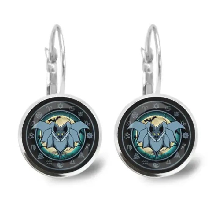 Серьги с декоративными элементами в виде летучей мыши. Изготовлены из бижутерного сплава со стеклянными вставками.