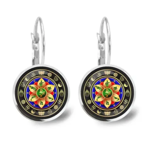 Серьги с буддийским символом Ом Мани Падме Хум. Изготовлены из бижутерного сплава, дизайн включает изображение под выпуклыми стеклянными линзами.
