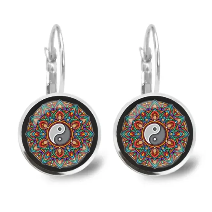 Серьги-мандала с символом инь-ян из бижутерного сплава с выпуклыми стеклянными линзами.