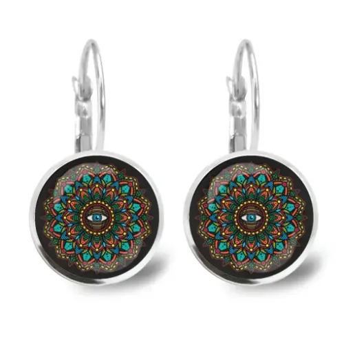 Серьги из бижутерного сплава с изображением мандалы под выпуклой стеклянной линзой.