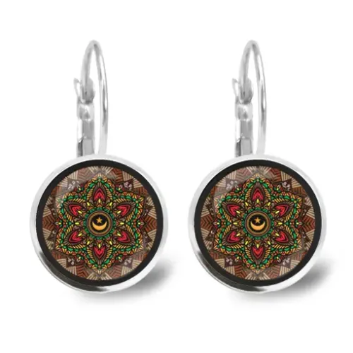 Серьги с изображением мандалы, звезды и полумесяца под выпуклыми стеклянными линзами.
