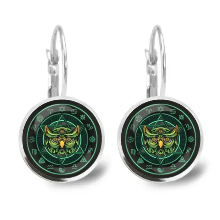 Серьги с изображением совы из бижутерного сплава со стеклянными линзами.