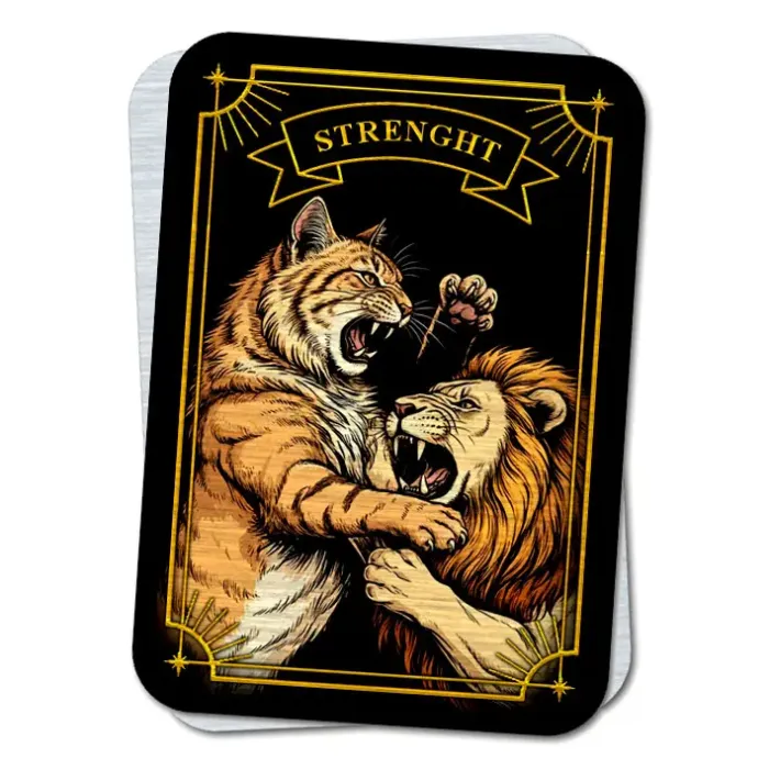 Кошачье Таро Strength - Сила представляет собой уникальный магнит, который символизирует мужество, сострадание и внутреннюю стойкость. Этот магнит станет отличным подарком для тех, кто ценит мягкую силу и умение управлять своими страстями через доброту.