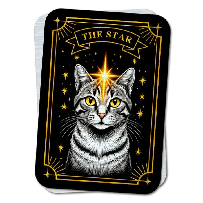 Кошачье Таро The Star - Звезда является символом надежды, веры и вдохновения. Этот магнит, выполненный из качественного металла толщиной 0,45 мм, станет не только оригинальным сувениром, но и источником покоя после бурь жизни. Размер магнита составляет 5,6х8 см, он поставляется в пакетике с описанием. В народной культуре такие магниты традиционно используются для создания позитивного настроя и привлечения удачи. Прекрасный подарок для любителей кошек и тех, кто ценит символику Таро.