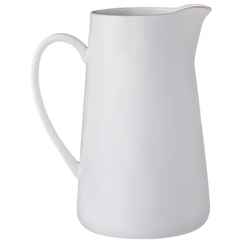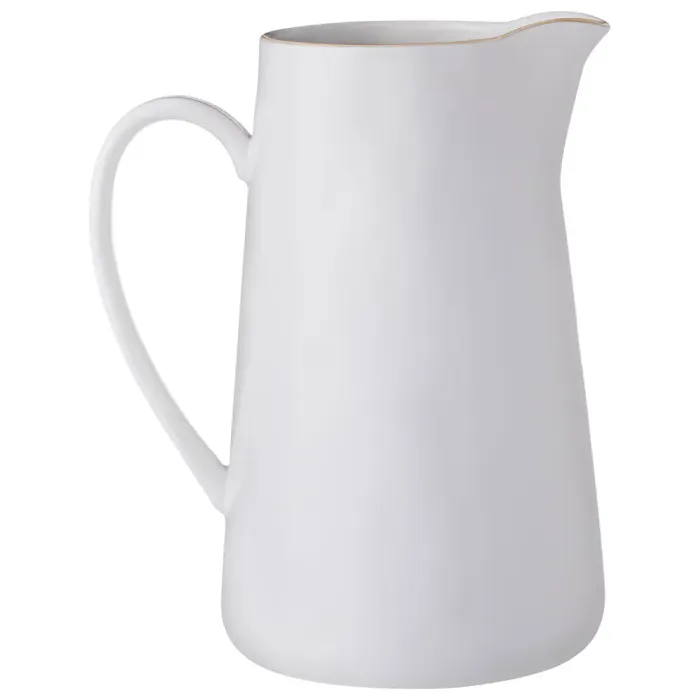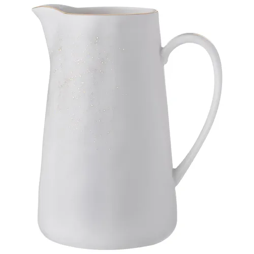 Кувшин выполнен из упрочненного фарфора, что повышает его прочность. Декоративное оформление включает тонкую золотую окантовку и мелкие золотые брызги. Конструкция с носиком и ручкой обеспечивает удобное использование.