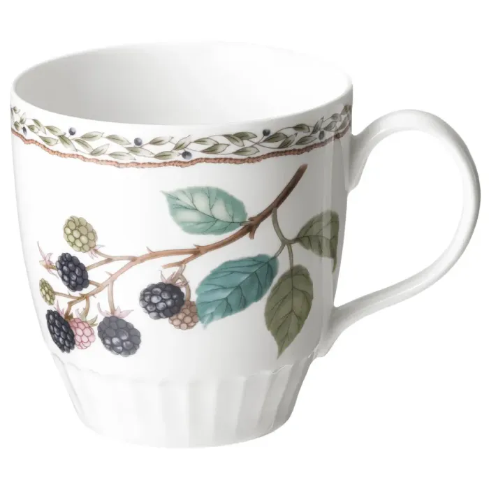 Кружка выполнена из фарфора, материала, известного прочностью и устойчивостью к высоким температурам. Поверхность украшена декором с изображением фруктов. Форма ручки рассчитана на удобный захват.