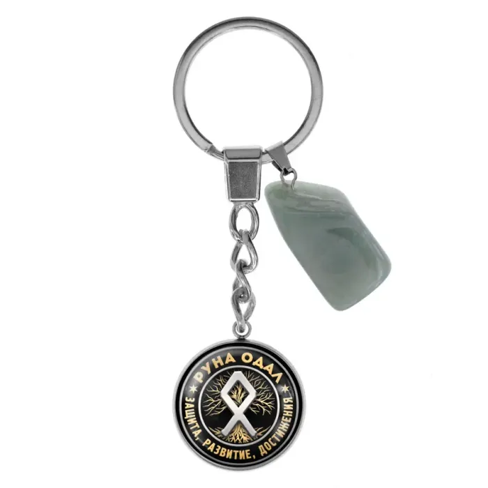 Брелок из нержавеющей стали Одал с натуральным камнем Нефрит — это не просто аксессуар, а символ доброты и семейного счастья. Он олицетворяет мужество, терпение и защиту от сглаза. Каждый камень уникален благодаря галтовке, что делает каждый брелок неповторимым.