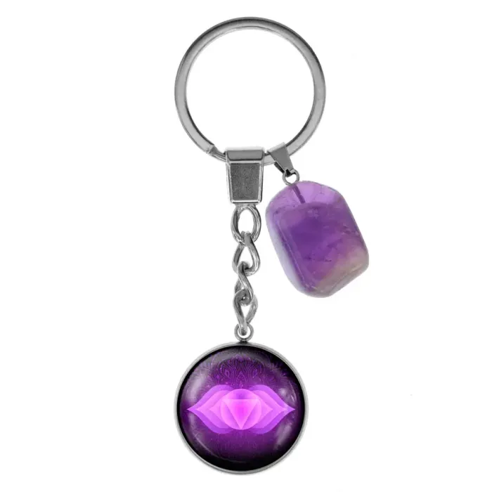 Брелок из нержавеющей стали Аджна чакра с натуральным камнем Аметист BKM-039