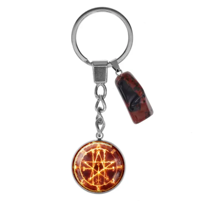 Брелок из нержавеющей стали с изображением Огненной пентаграммы и натуральным камнем Красной яшмы — это не только стильный аксессуар, но и символ защиты и удачи. Яшма традиционно ценится за свои свойства очищения и стимулирования, а также поддержку в карьере и личной жизни. Каждое изделие уникально благодаря индивидуальной форме камня (галтовка), что делает каждый брелок особенным. Диаметр изображения под стеклянной линзой составляет 25 мм, а в комплект входит кольцо для ключей и упаковка в виде пакетика. Этот брелок станет отличным подарком или дополнением к личной коллекции сувениров.