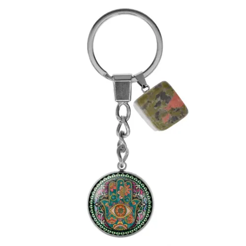 Брелок из нержавеющей стали Рука Фатимы с натуральным камнем Унакит BKM-052