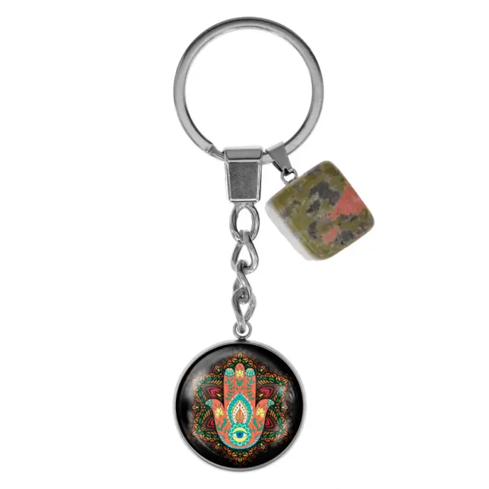 Брелок из нержавеющей стали Хамса с натуральным камнем Унакит BKM-062