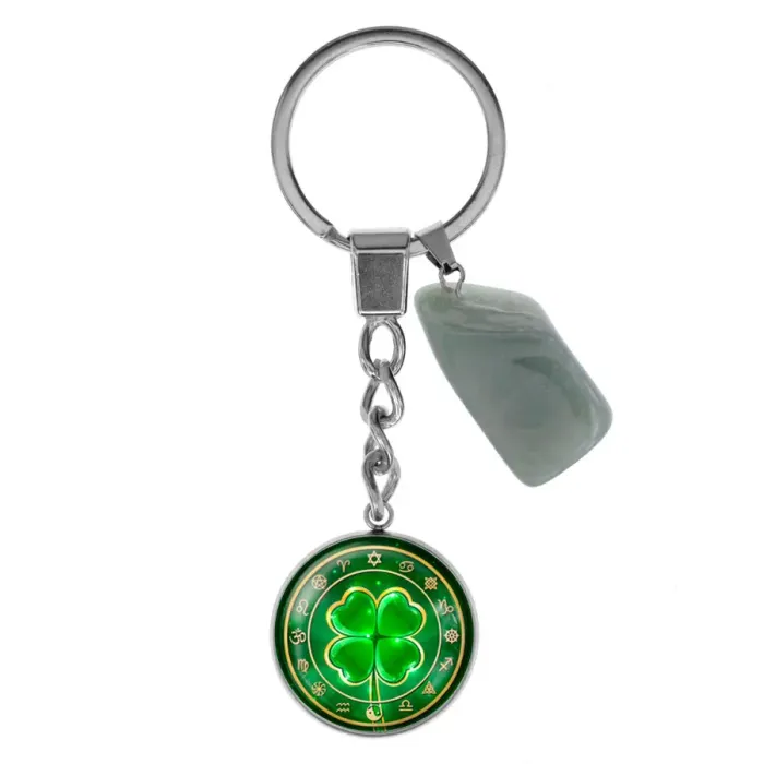 Брелок из нержавеющей стали Клевер удачи с натуральным камнем Нефрит BKM-063