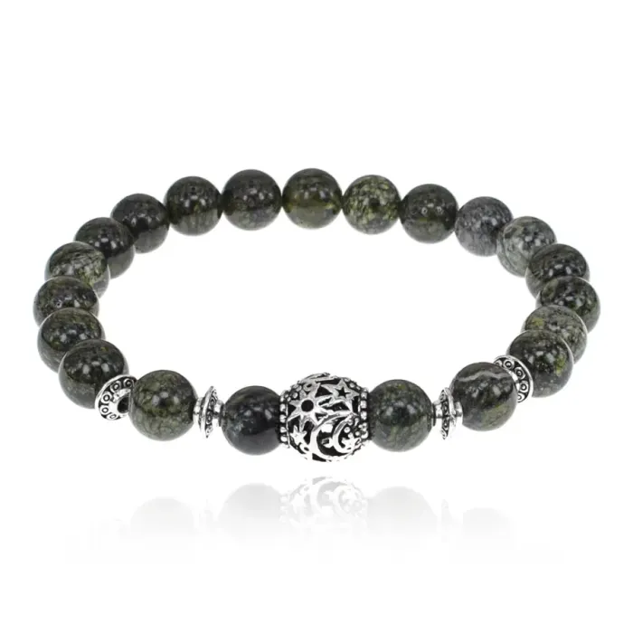 Стрейч-браслет, выполненный из бусин натурального змеевика, станет стильным аксессуаром и символом силы. Этот камень ценится за свою уникальную красоту и мистическую силу. Браслет украшен металлическими вставками с покрытием под серебро, что придаёт ему элегантный вид.