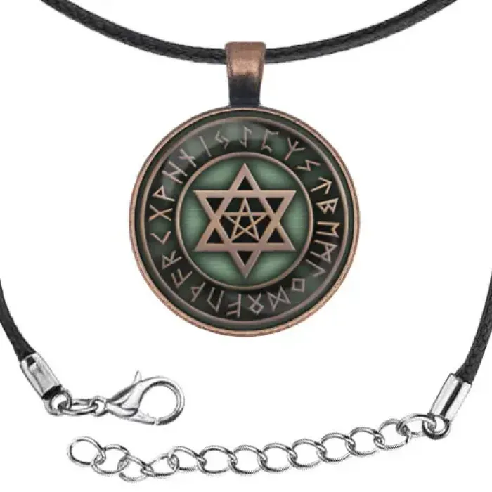 Кулон-амулет, сочетающий в себе символику Звезды Давида и пентаграммы, представляет собой уникальный аксессуар с глубоким культурным значением. Этот кулон из бижутерного сплава с медным покрытием украшен выпуклой стеклянной линзой, что придаёт ему особую выразительность.