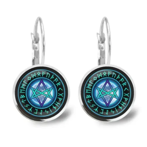 Серьги с изображением уникурсальной гексаграммы. Изготовлены из бижутерного сплава, изображение защищено выпуклой стеклянной линзой.