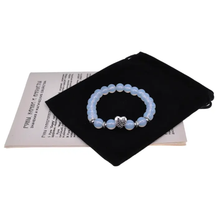 Стрейч-браслет, выполненный из бусин синтетического лунного камня, станет стильным аксессуаром и символом женственности. Металлические вставки с покрытием под серебро добавляют элегантности и утонченности. Внутренний диаметр браслета составляет примерно 5,5 см, а диаметр бусин – 8 мм. Размеры коннектора равны 1х1 см.