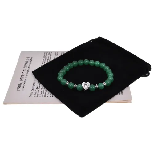 Стрейч-браслет с бусинами из натурального нефрита — символ доброты и сострадания, который помогает развивать терпение и выдержку. Вставки выполнены из металла с покрытием под серебро, что придаёт изделию элегантный вид. Внутренний диаметр браслета составляет около 5,5 см, а диаметр бусин — 8 мм. Размеры коннектора равны 1х1 см.