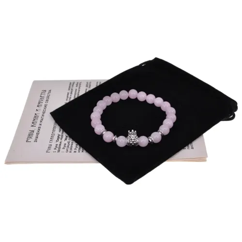 Стрейч-браслет, украшенный бусинами из натурального розового кварца, символизирует любовь и гармонию. Металлические вставки с покрытием под серебро добавляют элегантности. Внутренний диаметр браслета составляет около 5,5 см, а диаметр бусин — 8 мм. Размеры коннектора равны 1,5х1 см.