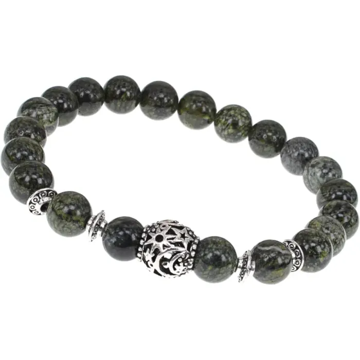 Змеевик традиционно ценится за свою способность предвидеть опасность и усиливать физическую мощь владельца. Он может помочь развить интеллектуальные способности и интуицию, что делает этот браслет не только красивым украшением, но и талисманом в повседневной жизни.