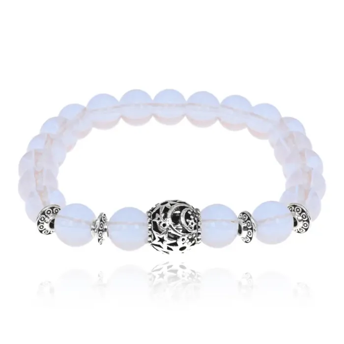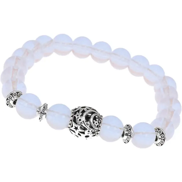 Стрейч-браслет с бусинами из синтетического лунного камня — идеальный аксессуар для тех, кто ценит красоту и символику. Лунный камень традиционно ассоциируется с женственностью и гармонией, что делает его отличным выбором для поддержки в любых делах. Металлические вставки с покрытием под серебро придают изделию элегантный вид.