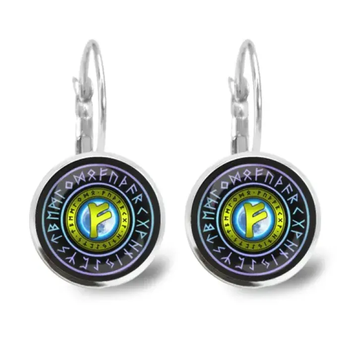 Серьги с изображением руны Феху. Изготовлены из бижутерного сплава с покрытием под серебро, имеют выпуклые стеклянные линзы и замок типа левербэк.