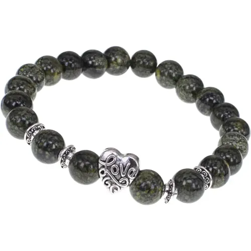 Стрейч-браслет Love выполнен из натурального змеевика, который ценится за свою красоту и уникальные свойства. Этот камень традиционно используется для предвидения опасностей и увеличения физической силы владельца.