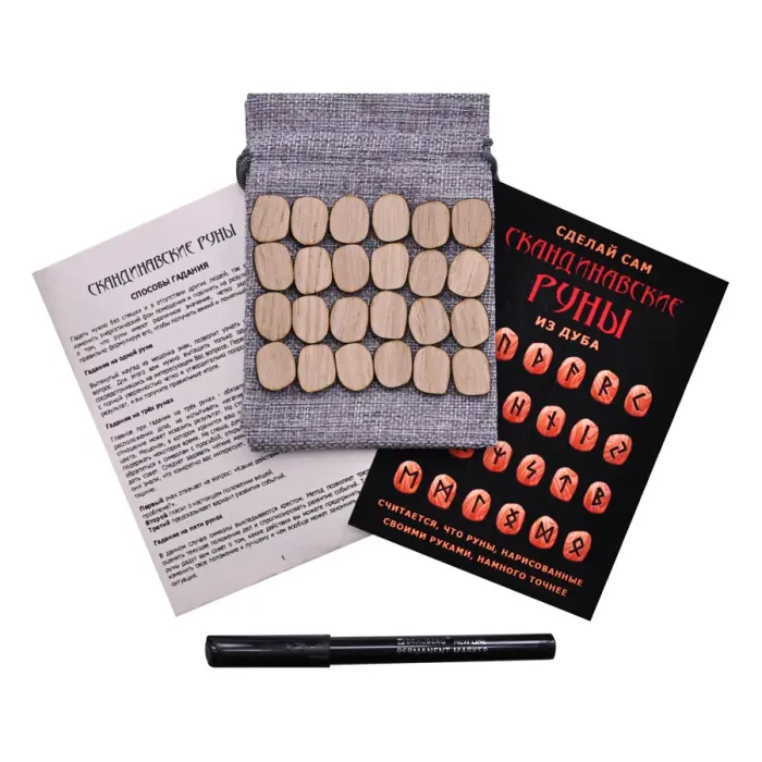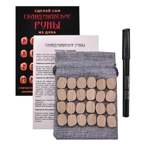 Набор для создания рун из дуба. Комплект включает заготовки, маркер и мешочек для хранения.