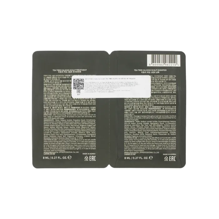 Комплекс ухода за волосами TEA TREE CALMING SCALP SACHET от Lador — это шампунь и бальзам, специально разработанные для чувствительной кожи головы. Продукт содержит экстракт чайного дерева, который эффективно успокаивает кожу головы. Пироктон оламин в составе снижает секрецию кожного сала, удаляет омертвевшие клетки и устраняет проблемы с перхотью. Экстракт центеллы азиатской помогает снять зуд и дискомфорт.