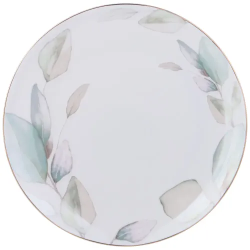 Костяной фарфор обеспечивает высокую прочность и легкость изделий. Тарелки имеют молочный цвет и прозрачные стенки, декорированы тонкой золотой окантовкой и рисунком в виде золотого цветка, лаванды и эвкалипта.