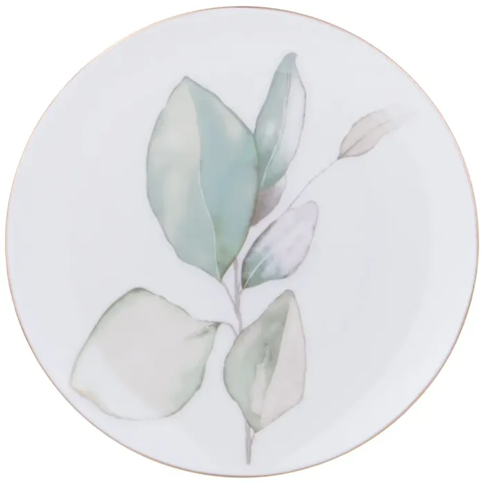 Тарелки изготовлены из костяного фарфора, который отличается высокой прочностью при тонких стенках и гладкой поверхностью. Поверхность украшена декором с изображением золотого цветка, лаванды и листьев эвкалипта с перламутровым блеском, а также тонкой золотой окантовкой по краю.