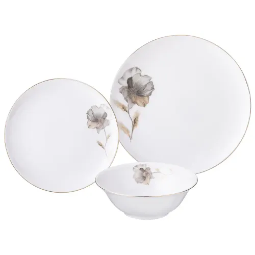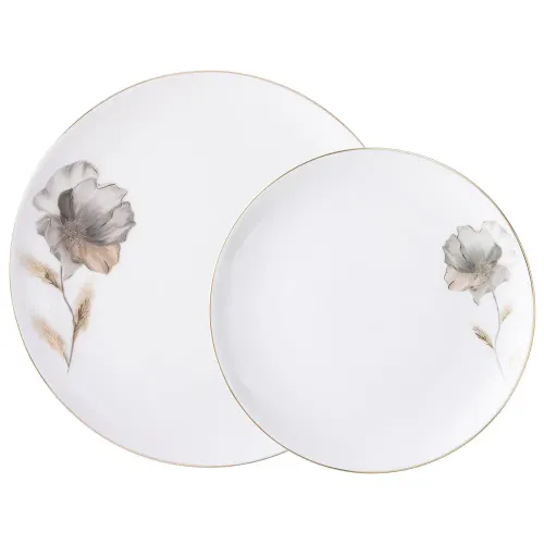 Набор посуды на 4 персоны из коллекции Inspiration от бренда Lefard включает 12 предметов, выполненных из костяного фарфора. Этот материал известен своей прочностью и легкостью, а также молочным оттенком. Декоративные элементы в виде золотого цветка и тонкой окантовки придают изделиям элегантность.