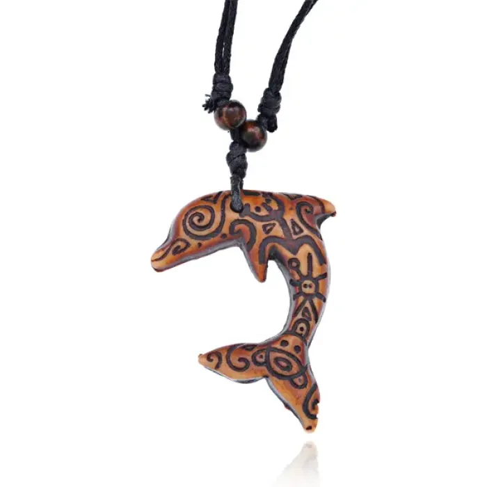 Амулет из пластика и дерева в виде дельфина на регулируемом шнурке.