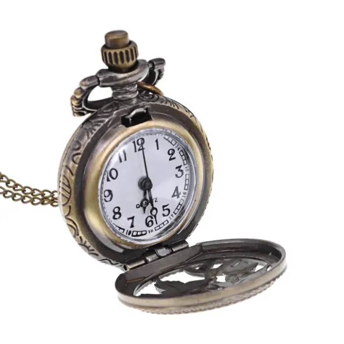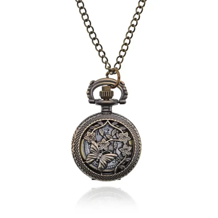 Кулон-часы с открывающимся корпусом из металла с дизайном в виде бабочки и цветов.