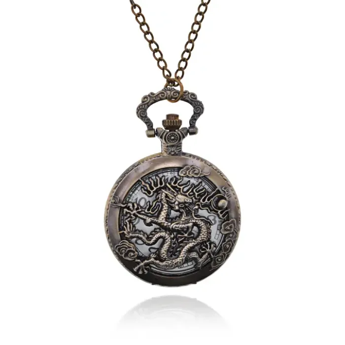 Открывающиеся часы-кулон с цепочкой в виде знака Восточного гороскопа Дракон. Изготовлены из металла с покрытием под бронзу.